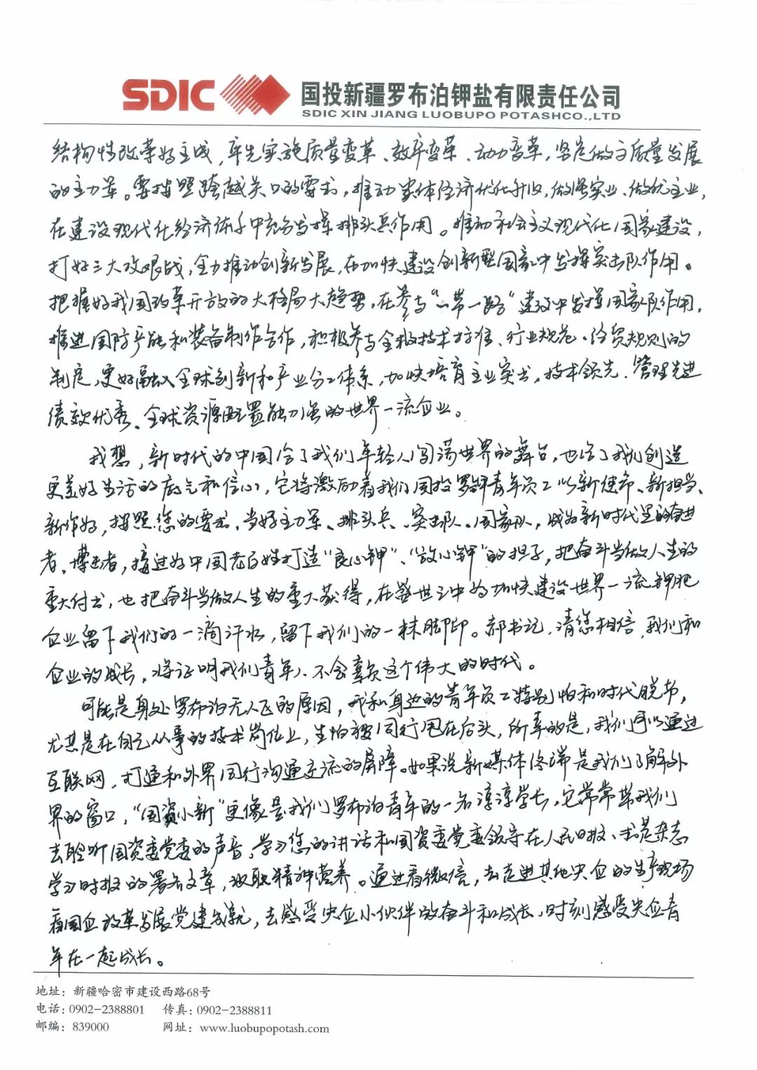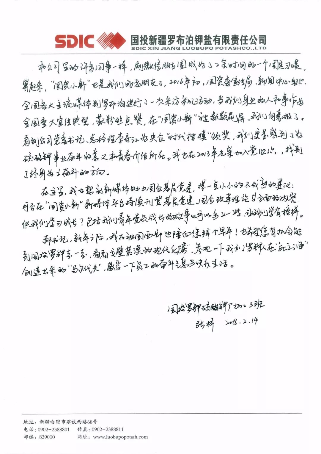 這封寫(xiě)給郝鵬書(shū)記的信,來(lái)自國(guó)投新疆羅布泊鉀鹽有限責(zé)任公司硫酸鉀廠(chǎng)加工車(chē)間加工三班的一位普通青年員工。