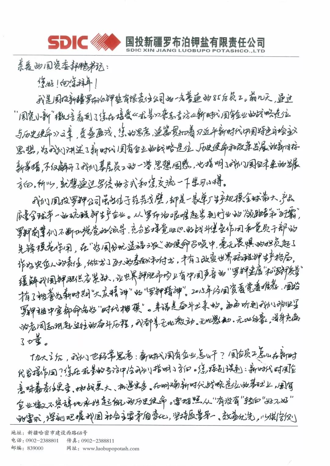 我是國(guó)投新疆羅布泊鉀鹽有限責(zé)任公司的一名普通的85后員工。前幾天,通過(guò)“國(guó)資小新”微信看到了您在接受《求是》雜志專(zhuān)訪(fǎng)的《新時(shí)代國(guó)有企業(yè)的戰(zhàn)略定位與歷史使命》文章,受益匪淺。您的思考,通篇貫徹著習(xí)近平新時(shí)代中國(guó)特色社會(huì)主義思想,為我們講述了新時(shí)代國(guó)有企業(yè)的戰(zhàn)略定位、歷史使命和改革發(fā)展的新目標(biāo)新舉措,不僅解開(kāi)了我們基層員工的一些思想困惑,也指明了我們國(guó)企未來(lái)的發(fā)展方向。所以,就想通過(guò)寫(xiě)信的方式和您交流一下學(xué)習(xí)心得。