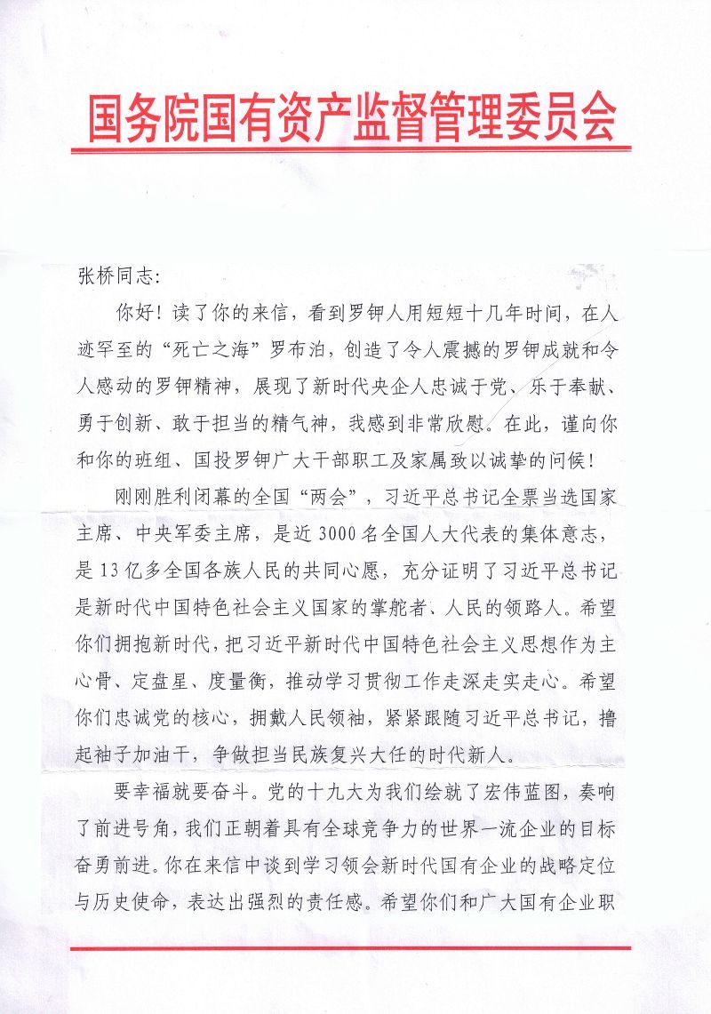 郝鵬書(shū)記收到這封千里之外的基層青年的來(lái)信后,在百忙之中親自寫(xiě)了回信。郝鵬書(shū)記在回信中對(duì)羅鉀人在羅布泊創(chuàng)造的成就、羅鉀人身上展現(xiàn)出來(lái)的新時(shí)代央企人的精氣神感到非常欣慰,并向廣大一線(xiàn)干部職工表達(dá)了衷心的祝賀和美好的祝福。