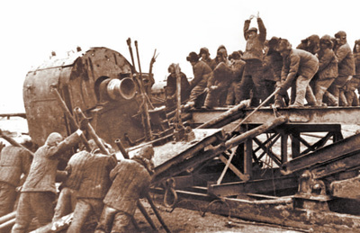 大會戰(zhàn)時期,王進喜(中)和鉆井工人們人拉肩扛運鉆機,保障鉆井作業(yè)。(資料圖片)